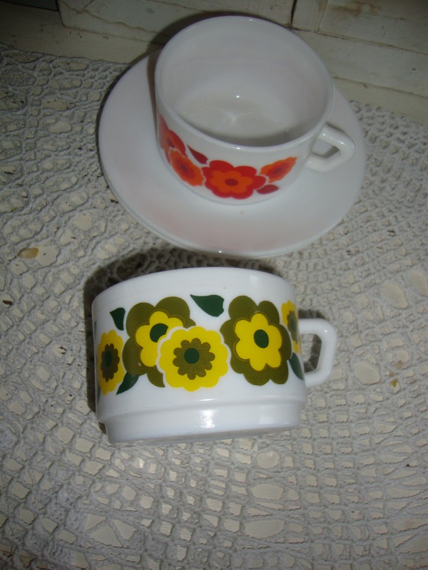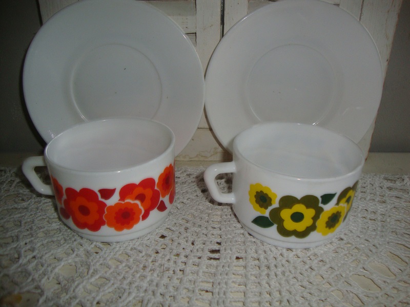 Twee grote kop en schotels van Arcopal France decor Lotus. De gele en oranje uitvoering van deze ruime koppen. Decor is als nieuw. Kan niet in de vaatwasser. Ideaal voor een koffie verkeerd of cappuccino of een kopje soep.