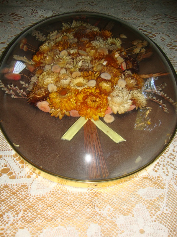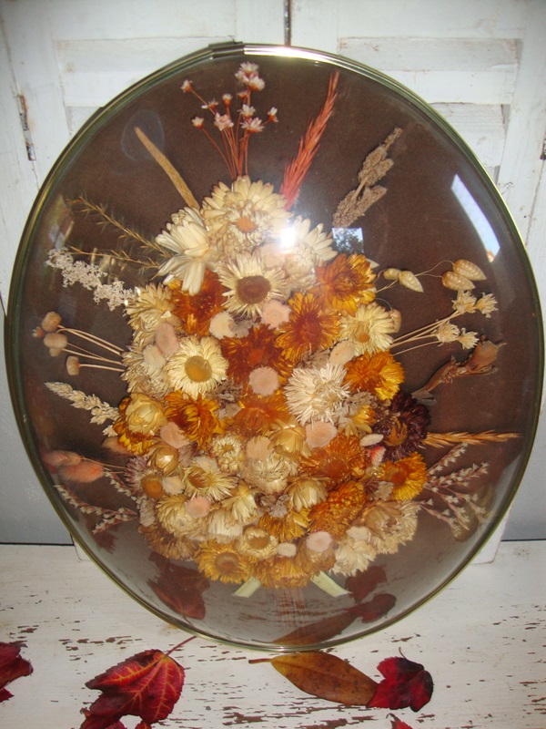 retro droogbloemen lijst met bol glas. Deze zeer grote lijst is 35x26 cm. De droogbloemen hebben nog een frisse kleur. Het mooie bolle glas is een oude techniek. Helaas ontbreekt het ophanglint (vandaar de kleine prijs) maar hij kan staan of liggen. De handige doe het zelver kan eenvoudig een ophanghaakje of lint bevestigen.