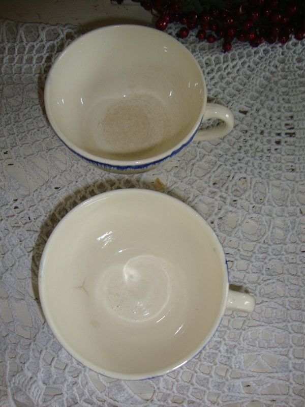 Wat een leuke oude Franse kopjes met hand geschilderde bloemen. Ze zijn oud en komen uit Frankrijk gemaakt door Digoin Sarreguemines.Het decor heet Mary-Lou. De twee ruime koppen, ideaal voor een cafe au lait, cappucinno of thee hebben geen chips of barsten maar wel wat verkleuring binnenin. Echte oudjes leuk om nog een ronde mee te gaan.
