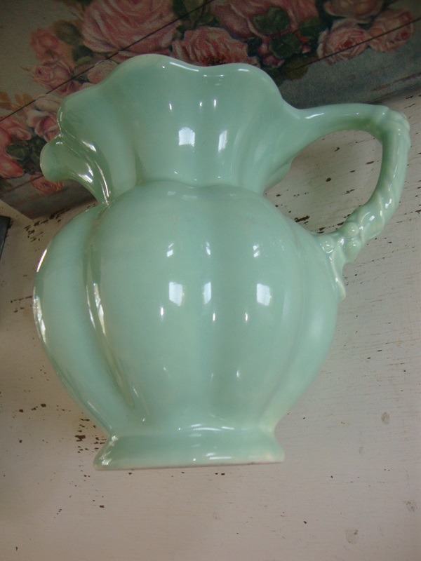 Decoratieve brocante mintgroene kan of vaas. De mooi vormgegeven kan is genummerd en heeft een mooie handgreep. Langs de rand zit een chip maar verder is de vaas in prima staat. Hij is genummerd. De hoogte is 15 cm