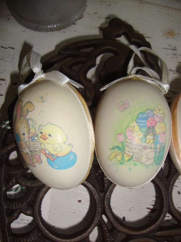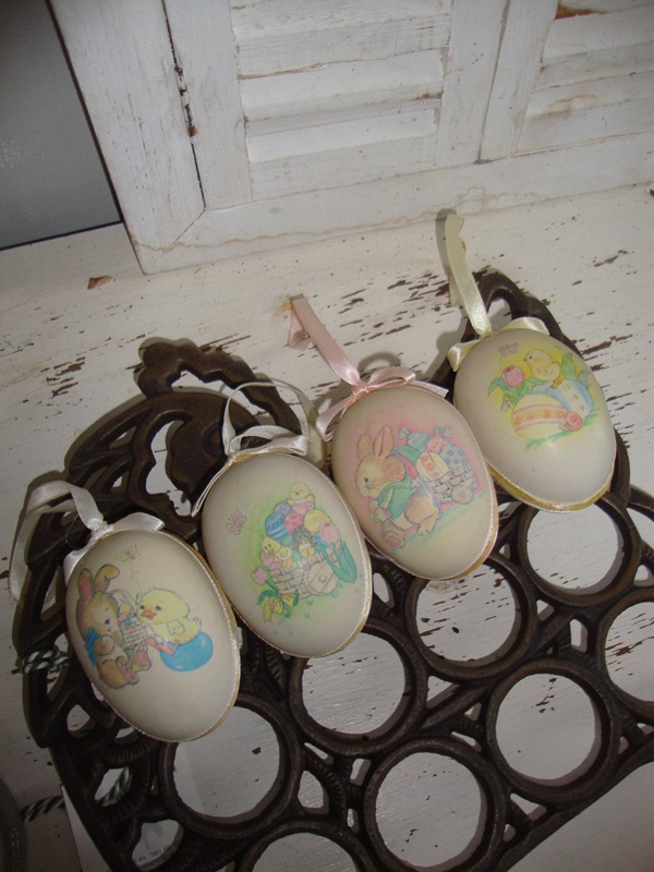 Vier mooie kunsstof eieren in pastel tinten met schattige vintage afbeeldingen van haasjes en kuikentjes. De eieren hebben allen een lintje om ze aan de paastakken te hangen. De eieren zijn vrij groot maar heel licht, ze zijn 7,5 cm.