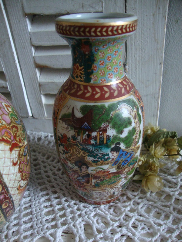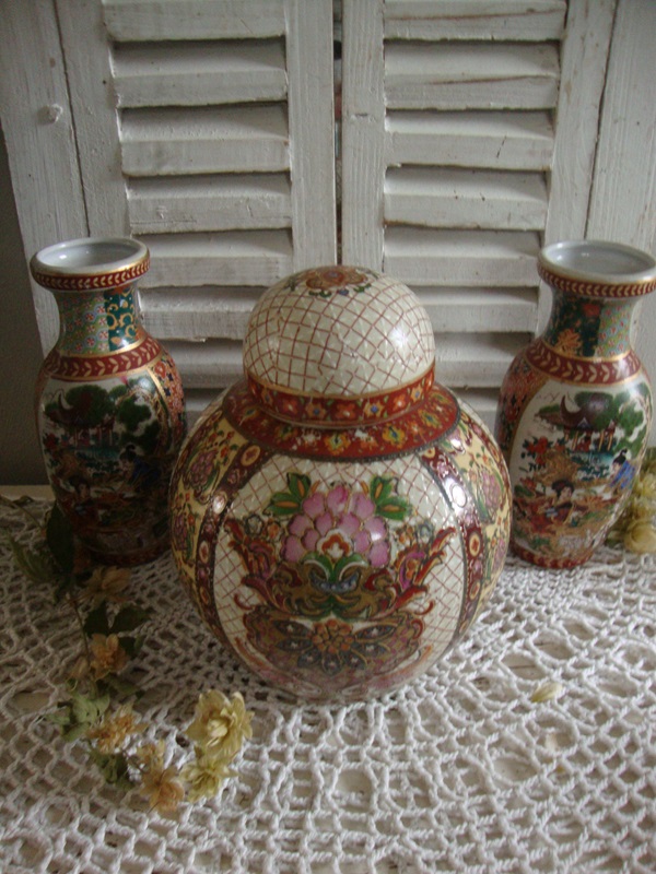 Prachtige set met oude Chinese vaasjes en gemberpot. Ze horen oorspronkelijk niet bij elkaar maar kleuren en patronen komen heel mooi overeen. De gemberpot en de vaasjes zijn 17 cm hoog. Alle drie gestempeld made in China.