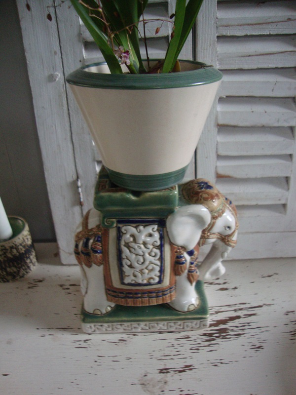 Keramiek Olifant asbak of plantentafeltje. Deze leuke olifant is prachtig bewerkt in groen en okergele kleuren. Erg leuk om een plantje op te zetten maar je kan hem natuurlijk ook als asbak gebruiken of gewoon voor decoratie neerzetten. Ook leuk om te combineren met vintage keramiek vazen in deze kleuren. De olifant is gaaf en hij is 14 cm hoog en breed.