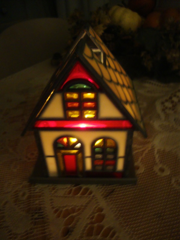 Kleurig Kerst huisje van kunststof glas in lood. De randjes zijn wel metaal maar de gekleurde stukjes zijn van kunsstof. Kan goed tegen hitte. Schijnt erg leuk door en geeft een glas in lood effect. Het huisje is 10.5 cm hoog en de voet is 9x9 cm. Er kan een (nep) waxinelichtje in geplaatst worden door de bodem te verwijderen.