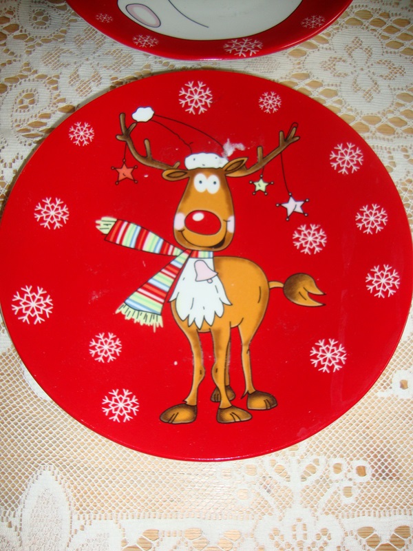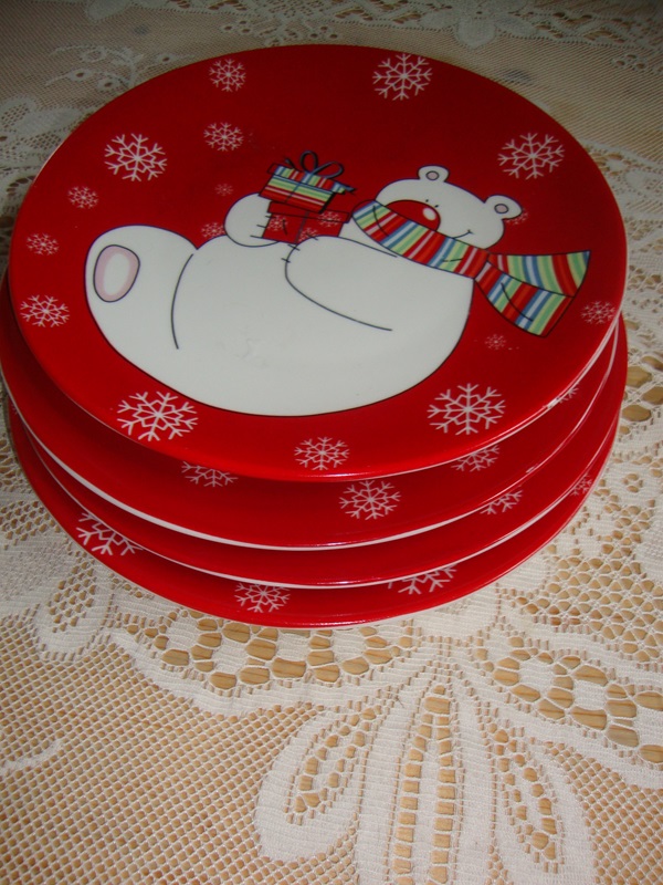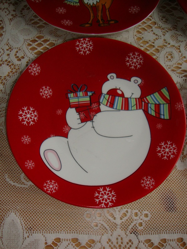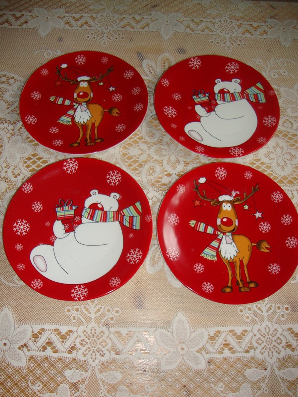 Set met vier vrolijke Kerstbordjes voor ontbijt of gebak. Zeker ook leuk voor de kinderen. Met vrolijke afbeelding van ijsbeer en rendier. Diameter 21 cm. Allen in nieuw staat.