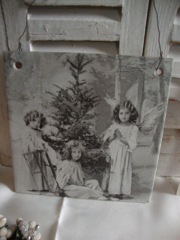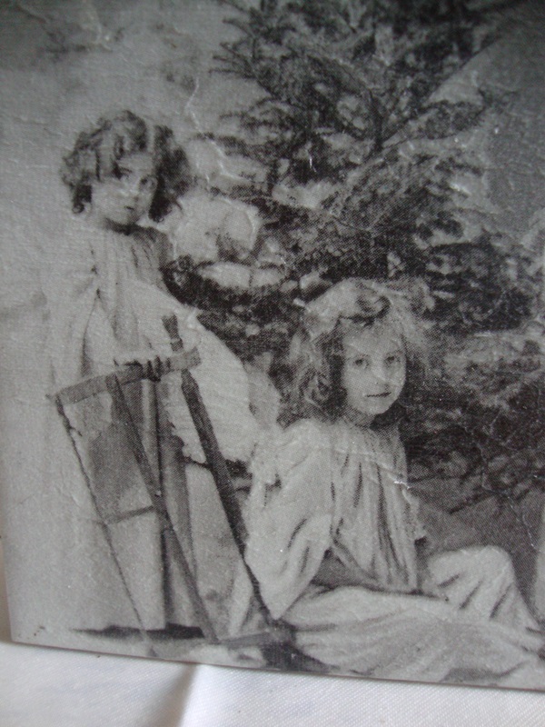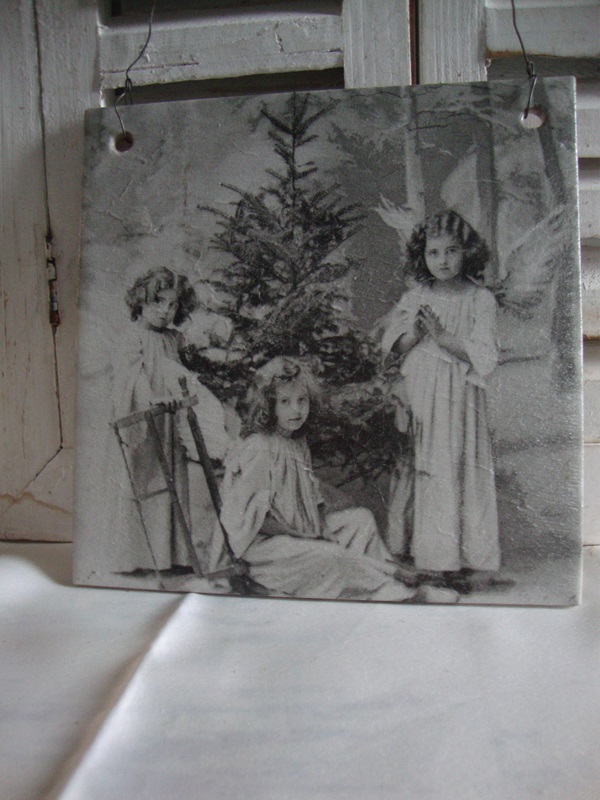 Deze nostalgische Kerst decoratie tegel heeft een zwart wit afbeelding met drie meisjes bij de Kerstboom. De tegel is bedoeld om ter decoratie op te hangen. Er zit nu een ijzerdraad aan maar ook mooi met een lint natuurlijk. Lief plaatje met als afmeting15x15 cm. Nostalgische Kerst zwart wit foto op tegel.