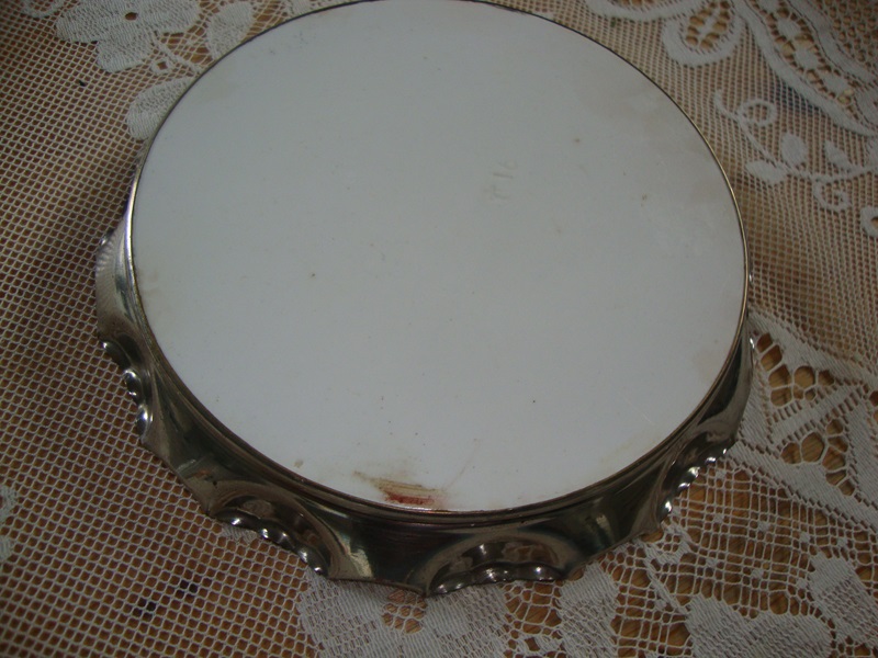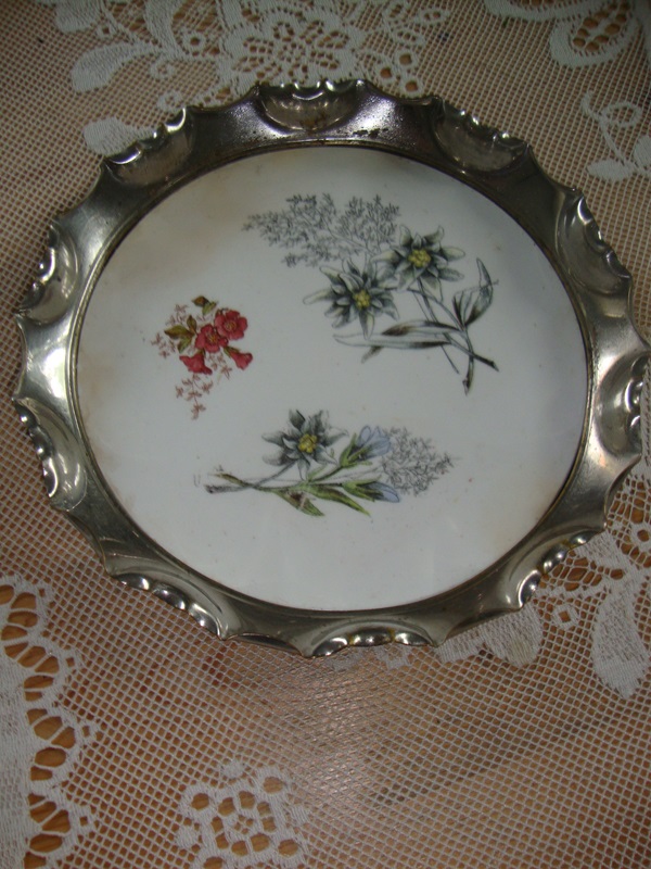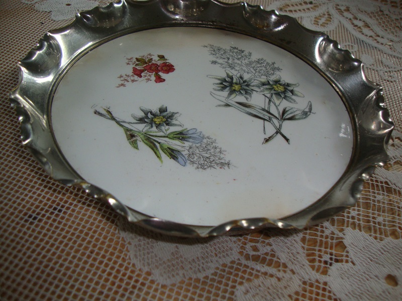 Gave onderzetter of klein dienblad met gegolfde zilverkleurige rand en afbeeldingen van Alpen bloemen. Op de porseleinen tegel staan afbeeldingen van Edelweiss, Gentiaan en Alpenroosje. Het porselein is gaaf met lichte verkleuring langs de rand. Leuk als presenteerschaaltje gebaksschotel of ter decoratie. De diameter is 18,5 cm.
