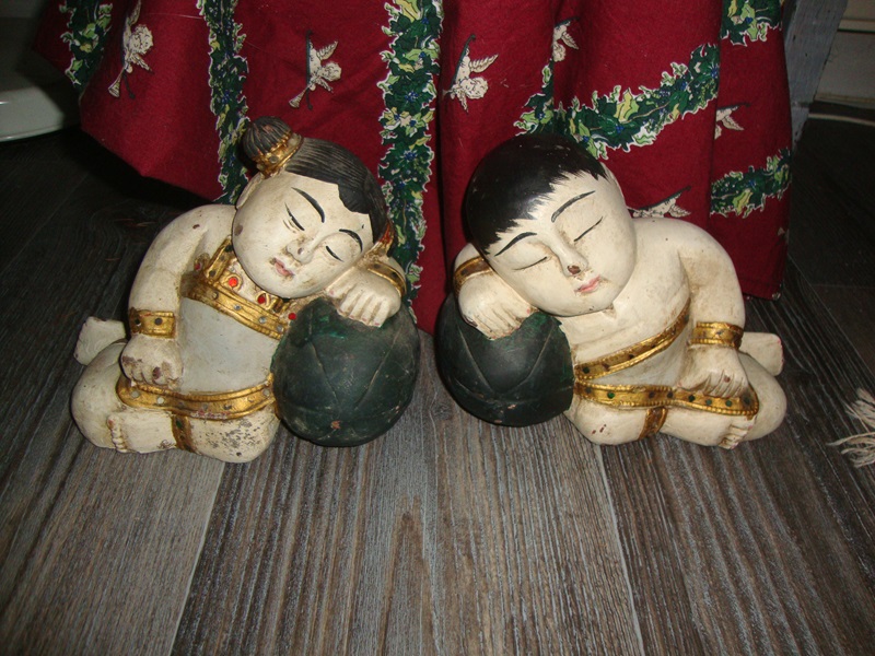 Twee prachtige houtgesneden beelden van Boeddha of gelukskinderen rustend op een meloen. Het meisje is versiert met glittersteentjes waarvan er een paar missen. De beelden zijn in goede doorleefde staat. Ze zijn handgeschilderd en heel decoratief. De afmetingen zijn H 16 cm B20 cm