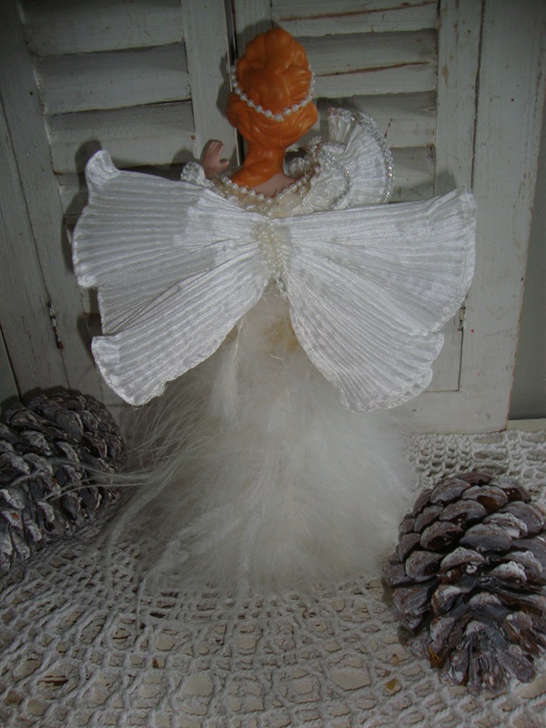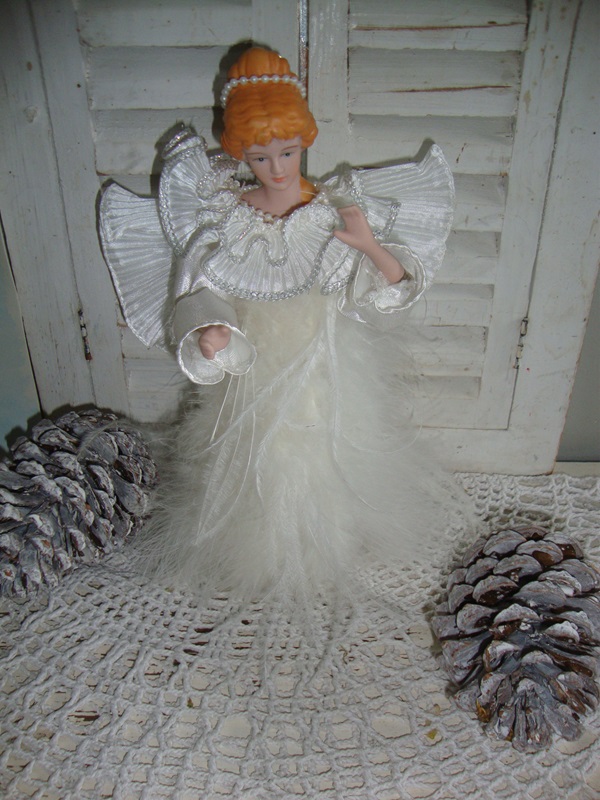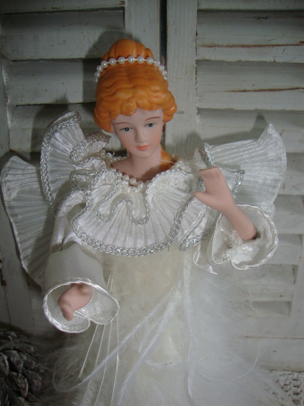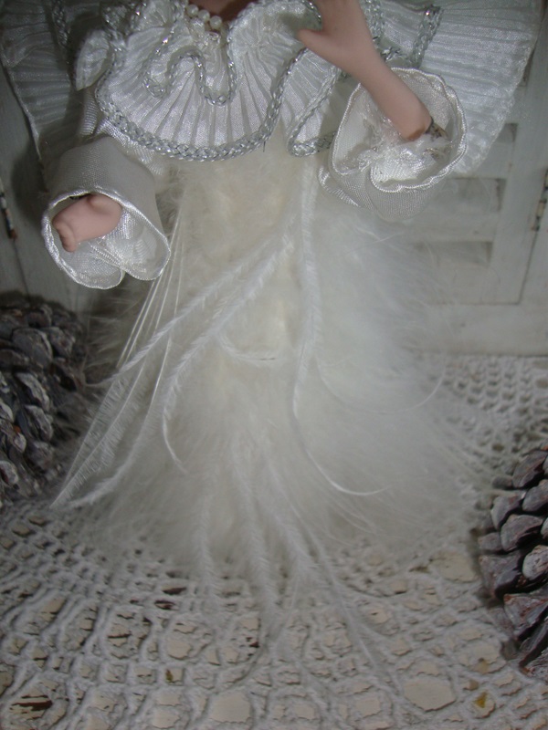 Grote porselein engel met veren. Deze mooie engel met veren, kraaltjes en satijn heeft porselein handjes en een fijn gezichtje. De engel is geschikt om neer te zetten bijvoorbeeld met de Kerstdagen maar kan ook als boomtopper boven op de kerstboom staan. Prachtige brocante engel van 24 cm hoog.