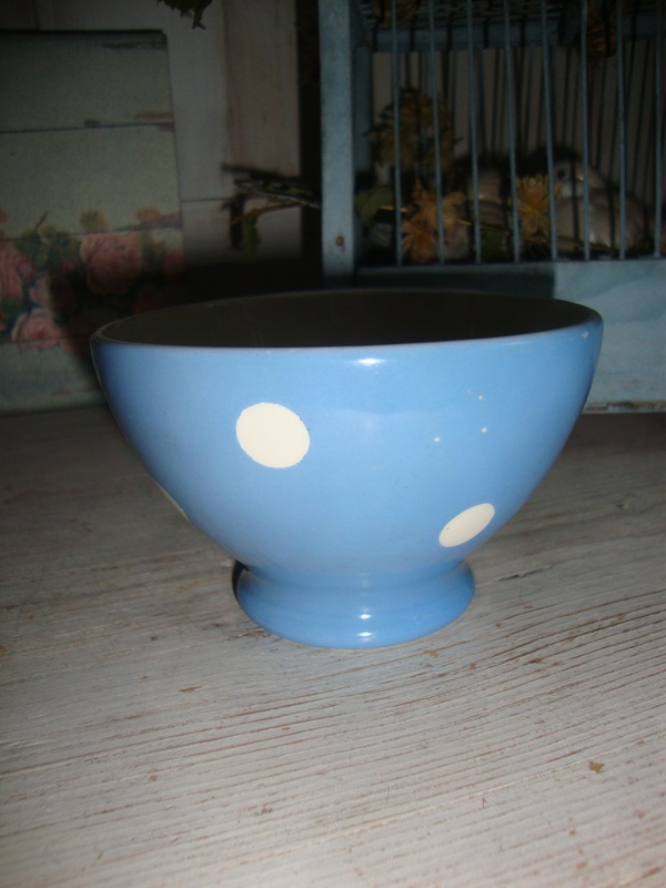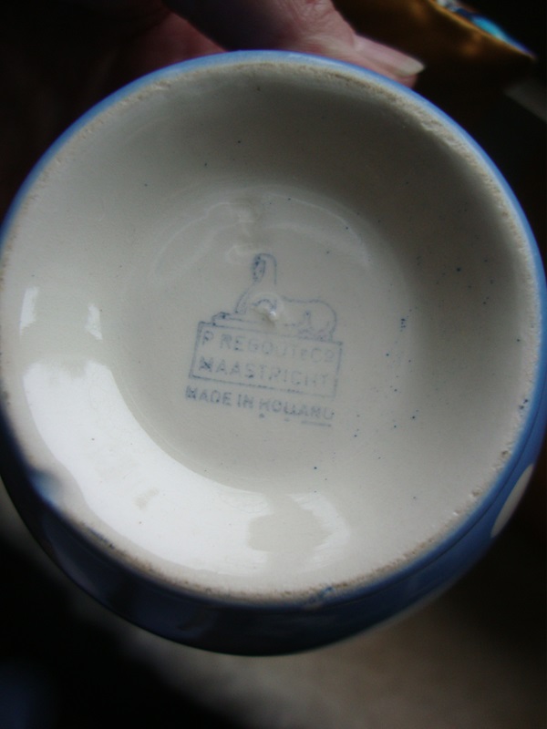 Mooi gaaf theekommetje van Petrus Regout. Lichtblauw met witte stip. Diameter 11 cm hoogte 7 cm. Mooi kommetje voor thee of koffie of een paar koekjes of snoepjes.