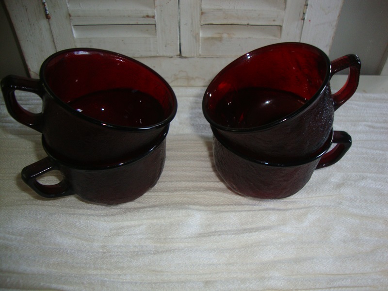 Vier vintage Arcoroc Ruby kopjes uit Frankrijk. Deze persglas punch kopjes zijn ook prima voor koffie. De binnenkant is glad de buitenkant geribbeld. Stevige robijn rode glazen kopjes uit de vorige eeuw.