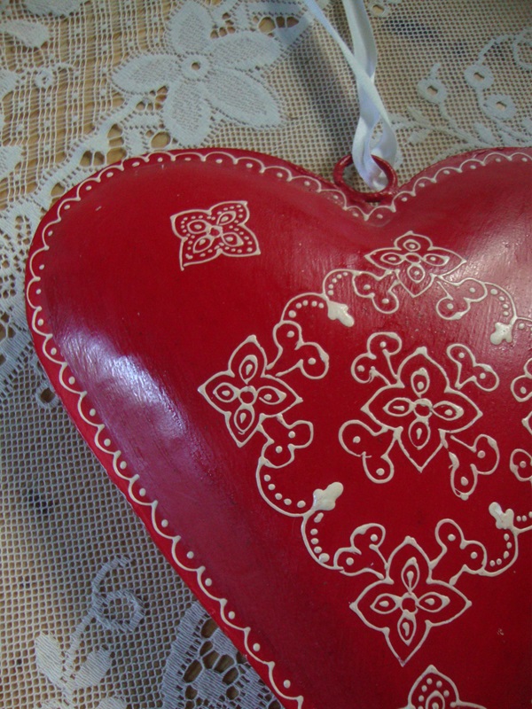 Vrolijk folkloristisch rood wit beschilderd metalen hart. Het hart is wel 25 cm hoog en breed. Handgeschilderd en vroeger uitgegeven door Clayre en Eef. Leuke decoratie om op te hangen met Kerst of rond Valentijnsdag of Bruiloft.