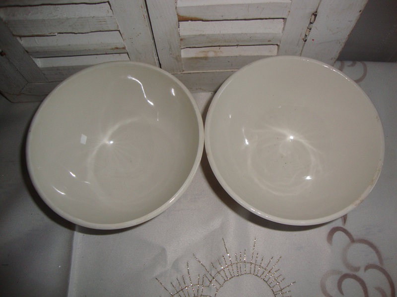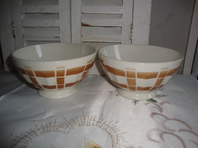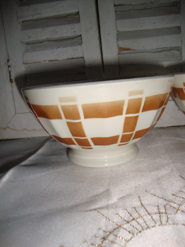 Mooie set vintage Franse café au lait kommen (spoelkommen) met een bruin geblokt patroon. Deze kommen werden traditioneel gebruikt voor koffie met melk bij het ontbijt. Ze zijn gemaakt van aardewerk zonder handvatten. De doorsnede is 13 cm en de hoogte is 7 cm. Beide kommen zijn gaaf. Leuk om te stapelen met andere Franse kommen, als bakjes voor snacks of nootjes, voor toetjes en soep.