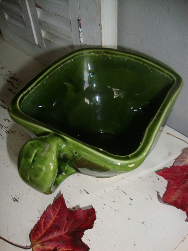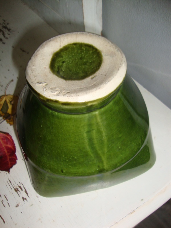 Mooi donkergroen geglazuurd aardewerk kommetje een zogenaamde vuurtest. Deze werden vroeger met de gloeiende kooltjes in de stoof gezet om warme voeten te houden. Nu een leuk schaaltje voor snoepjes, of als bloempotje. Mooie groene herfstkleur en helemaal gaaf. Het potje heeft een oor. De afmetingen zijn: bovenkant 11,5 x11,5 cm en hoogte 9 cm.